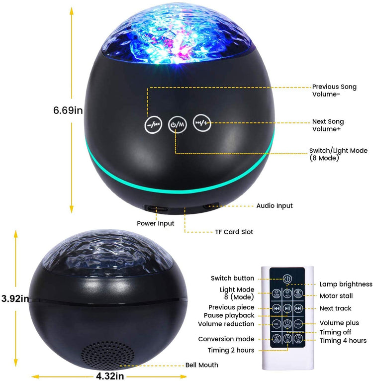 - 8 Lighting Modes & 3 Brightness Levels: The music projector is designed with 3 colored lights(Blue/Green/Red) make up 7 different kinds of stage ocean wave lights effects modes and 1 atmosphere light mode. 3 different brightness levels allow you to choose which mode show depending on your mood or the surrounding at ease, and help children or adults sleep peacefully. A great night light for assisting sleep.